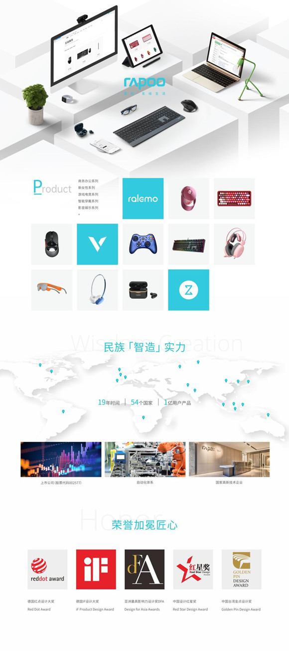 雷柏連年受邀參加德國IFA、美國CES等全球消費電子大展,展現新國貨魅力。屢獲德國IF設計獎、德國Reddot紅點設計大獎、日本G-Mark設計獎、亞洲DFA最具影響力設計獎、中國創新設計紅星獎、中國臺灣金點設計獎等國內外權威設計獎,讓3C硬件重塑新動力與新方向,重構想象。向世人展現新國貨的標桿實力。