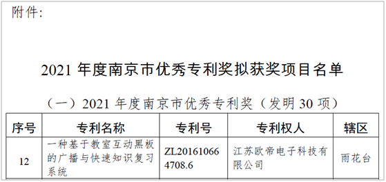 江蘇歐帝提交的“一種基于教室互動黑板的廣播與快速知識復習系統”(201610664708.6)參加南京市優秀專利獎申報項目,經過評比,該專利獲得2021年度南京市優秀發明獎。