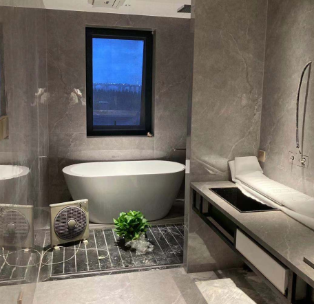 洗漱間同樣利用筒射燈對洗漱臺、浴缸等地點對點照明,分隔不同功能區(qū)域;利用燈帶照亮臺下,驅(qū)散暗角,提升洗漱臺整體視覺亮度。