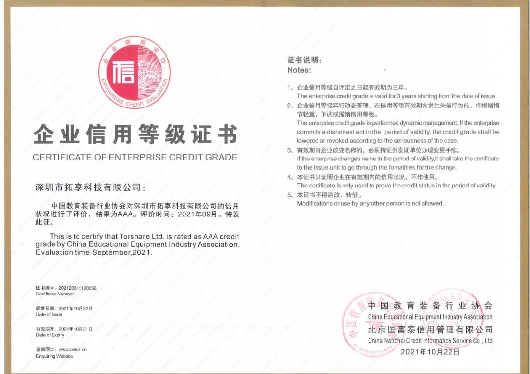 10月11日,中國教育裝備行業(yè)協(xié)會官方發(fā)布《關(guān)于公布2021年教育裝備行業(yè)企業(yè)信用等級評價結(jié)果的通知》,深圳市拓享科技有限公司榮獲2021年教育裝備行業(yè)企業(yè)信用AAA級榮譽證書。