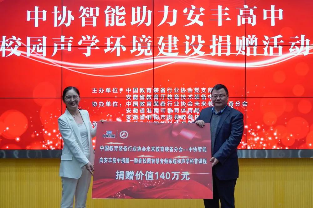 為貫徹落實黨中央的決策部署,踐行“我為行業辦實事”的時代新風和價值導向,2021年10月13日,由中國教育裝備行業協會黨支部、安徽省教育技術裝備中心主辦,中國教育裝備行業協會未來教育裝備分會、淮南市教育體育局、壽縣教育體育局協辦,江蘇中協智能科技有限公司(以下簡稱中協智能)支持的“我為行業辦實事 優質資源進校園”捐贈活動在安徽省淮南市壽縣安豐高中舉行。
