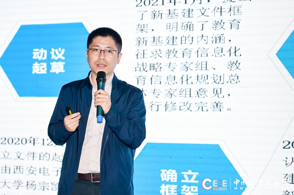 任昌山在會上對“教育新基建”政策進行了全面解讀。他認為,教育新基建的“新”主要體現在三個方面:第一,新內涵。新基建是相對傳統基建而言的,傳統基建大多指建筑工程,新基建以信息網絡為基礎,根據國家發改委的表述,可分為信息技術設施,融合基礎設施和創新基礎設施三類。第二,新技術。教育新基建是對教育信息化現有發展基礎的傳承和創新,要更加注重新一代信息技術的廣泛應用。支撐以5G、人工智能、云計算、區塊鏈等為代表的新一代信息技術與教育教學實踐深度融合,培育教育信息化發展的新動能。第三,新機制。推動教育新基建,要充分發揮各方力量,構建多方協同的教育供給新生態,加強部際協同、部省聯動和區域協調,促進算力資源、教育數據、教育應用的開放共享,實現集約部署和高效利用。