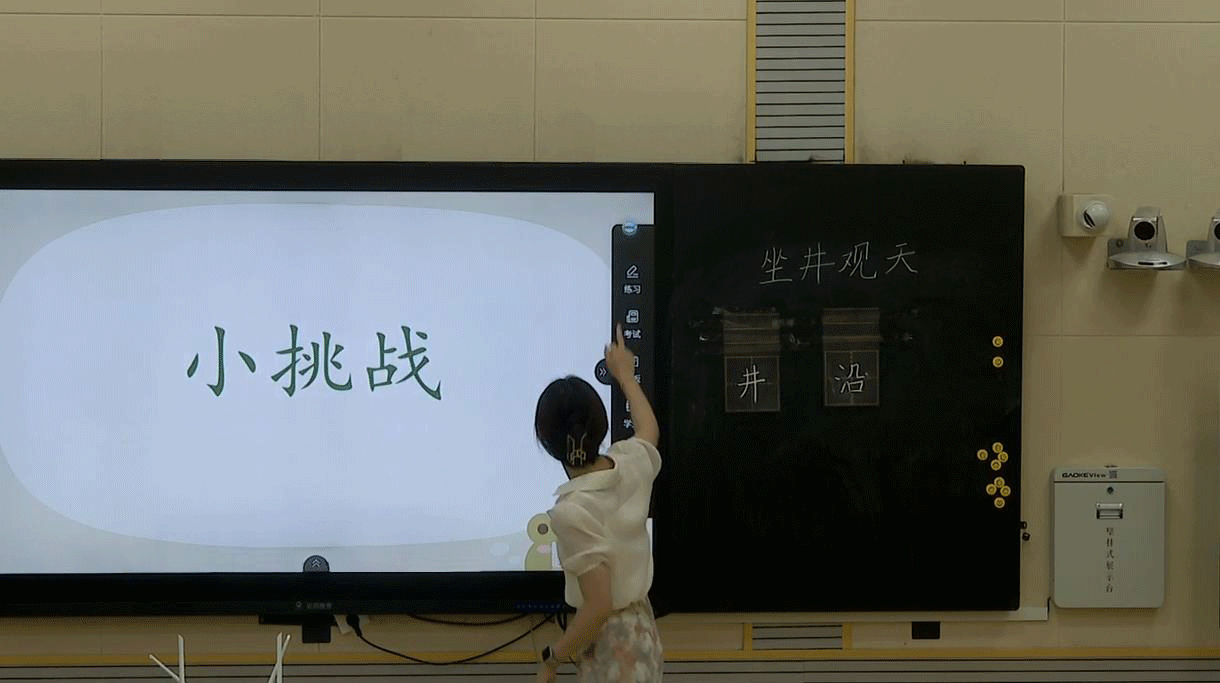 在彎塘小學的這堂語文課上,云蝶智慧課堂系統隱藏在屏幕左右兩側,與老師演示的PPT融為一體,一鍵點擊即可展開、收起菜單欄,不改變老師的授課習慣,同時保證了教學過程的流暢性。