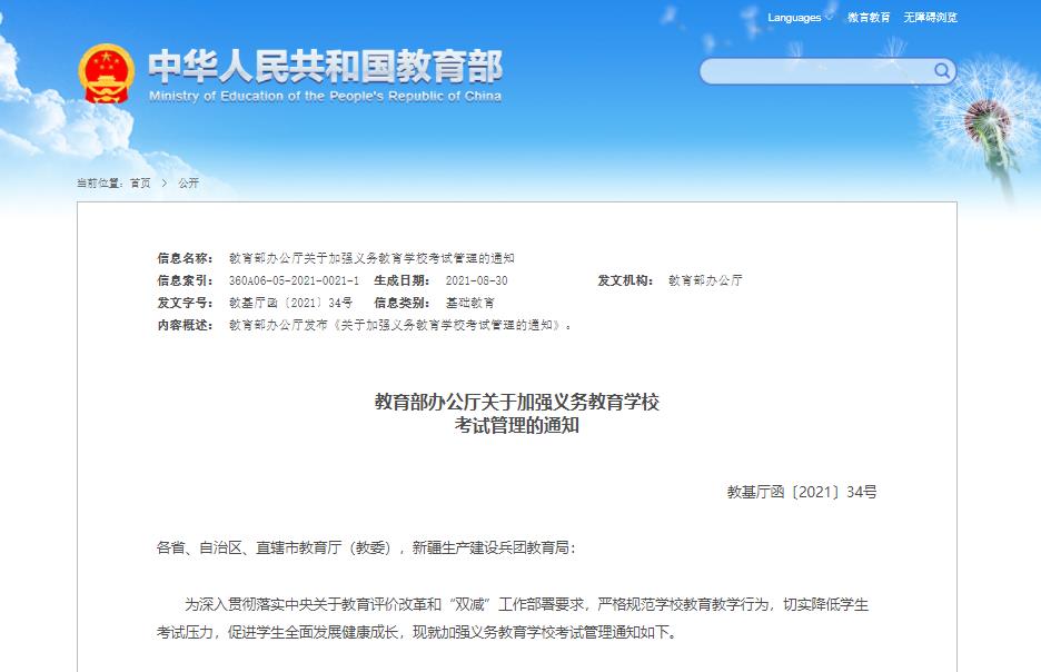 8月教育部印發《關于加強義務教育學�?荚嚬芾淼耐ㄖ�,提出了準確把握考試功能、大幅壓減考試次數、規范考試命題管理、合理運用考試結果、完善學習過程評價、加強學業質量監測、健全管理監督機制等要求。