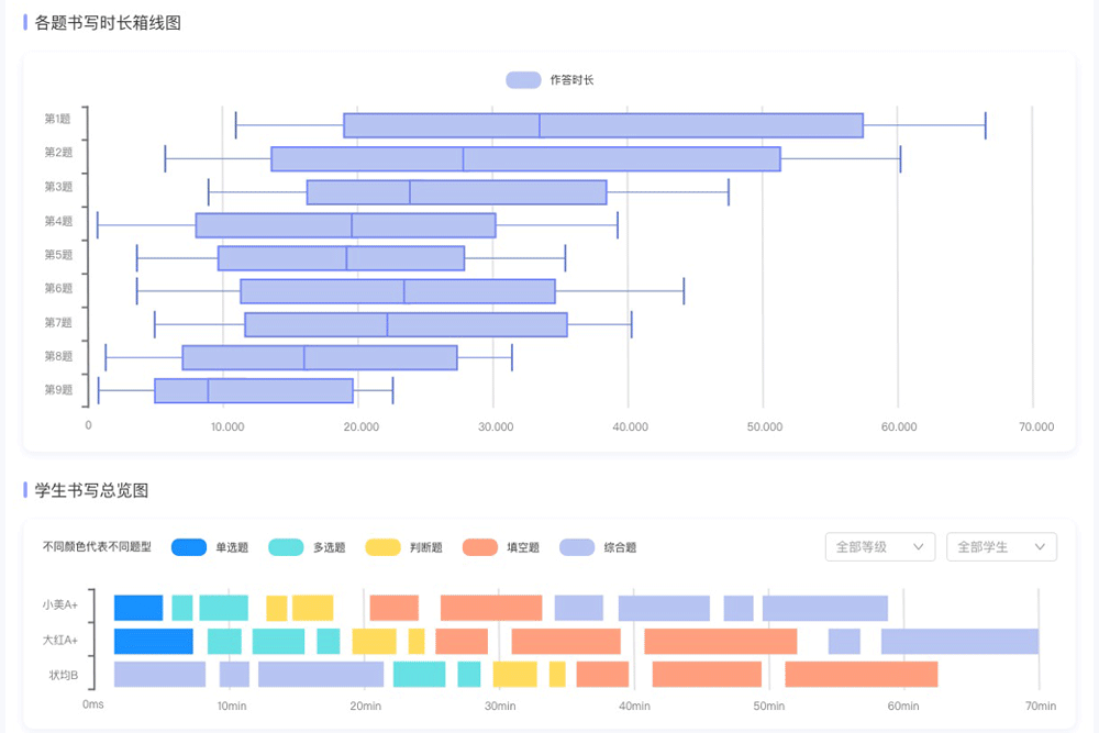 教研閱卷所記錄的高頻錯因特征,以及得分率、答題時長、成績分布、知識點掌握情況自動匯總統計,一圖呈現。從多個維度指標,為教學決策提供精準分析和指導。從考試結果這個單一評判標準,轉變為對考試過程的多維度評判,進而更加精準地檢驗學生的知識掌握。