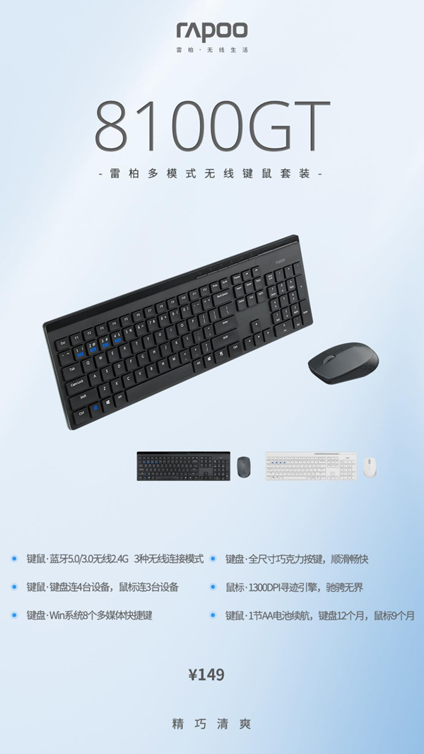 在這個快節奏的時代,相信很多人都希望能夠擁有分身這項技能,雷柏8100GT多模式無線鍵鼠套裝擁有藍牙5.0/3.0和2.4G三種智能連接方式,支持多設備切換,續航持久,輕松應對繁瑣工作。鍵盤8個多媒體快捷鍵搭配巧克力按鍵,按鍵輕盈如水,工作娛樂兩不誤。鼠標1300DPI尋跡引擎能適用在多介質表面。官方指導價149元,現已上市!