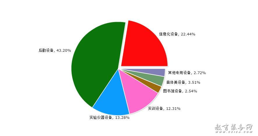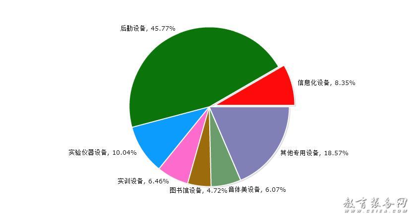 根據對教育裝備細分的歸納,教育裝備網將教育裝備具體劃分為七大類,即信息化設備(含智能平板、錄播系統、智慧黑板等),后勤設備(含校園基建、安防設備、食堂設備、課桌椅等),實驗儀器設備(含儀器儀表、實驗室平臺等),實訓設備(含實訓系統、實訓設施等),圖書館設備(含借還系統、微型圖書館等),音體美設備(含樂器、體育設施、美術用品等),其他專用設備(含創客教育、心理健康特教設備等)。