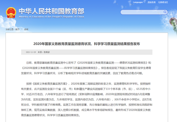 日前,教育部基礎教育質(zhì)量監(jiān)測中心發(fā)布了《2020年國家義務教育質(zhì)量監(jiān)測——德育狀況監(jiān)測結(jié)果報告》和《2020年國家義務教育質(zhì)量監(jiān)測——科學學習質(zhì)量監(jiān)測結(jié)果報告》。