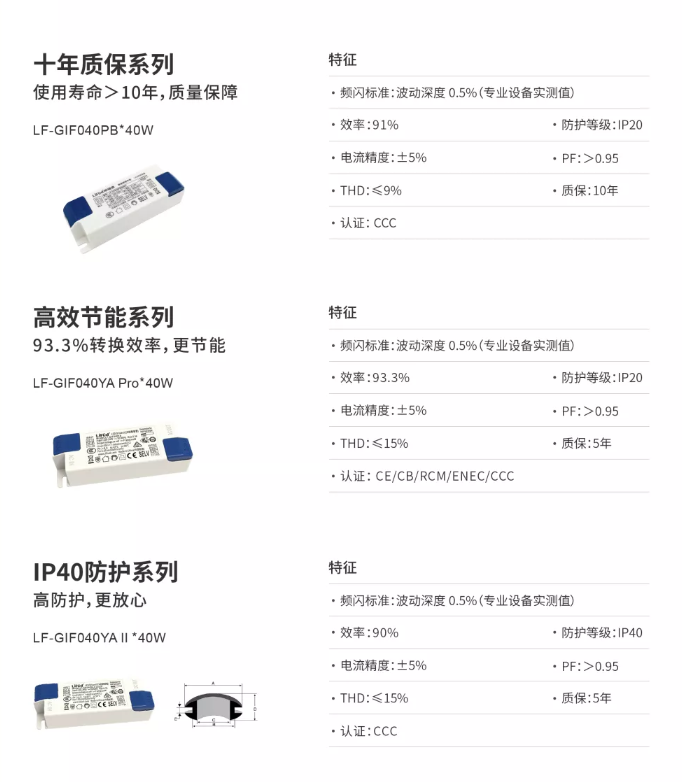 ·恒流AAB調(diào)光&ABB雙色溫、恒壓GAB調(diào)光(B)&調(diào)光調(diào)色(A)電源:四大類別12個(gè)型號(hào)近百款標(biāo)準(zhǔn)參數(shù),可滿足不同燈具需求
