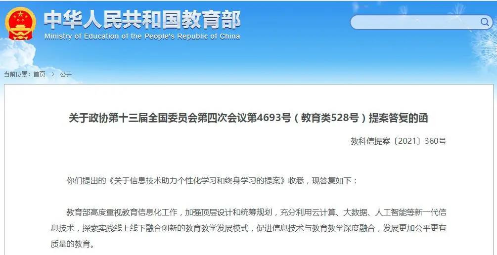日前,針對政協第十三屆全國委員會第四次會議第4693號(教育類528號)提出的《關于信息技術助力個性化學習和終身學習的提案》,教育部網站公布其答復情況。