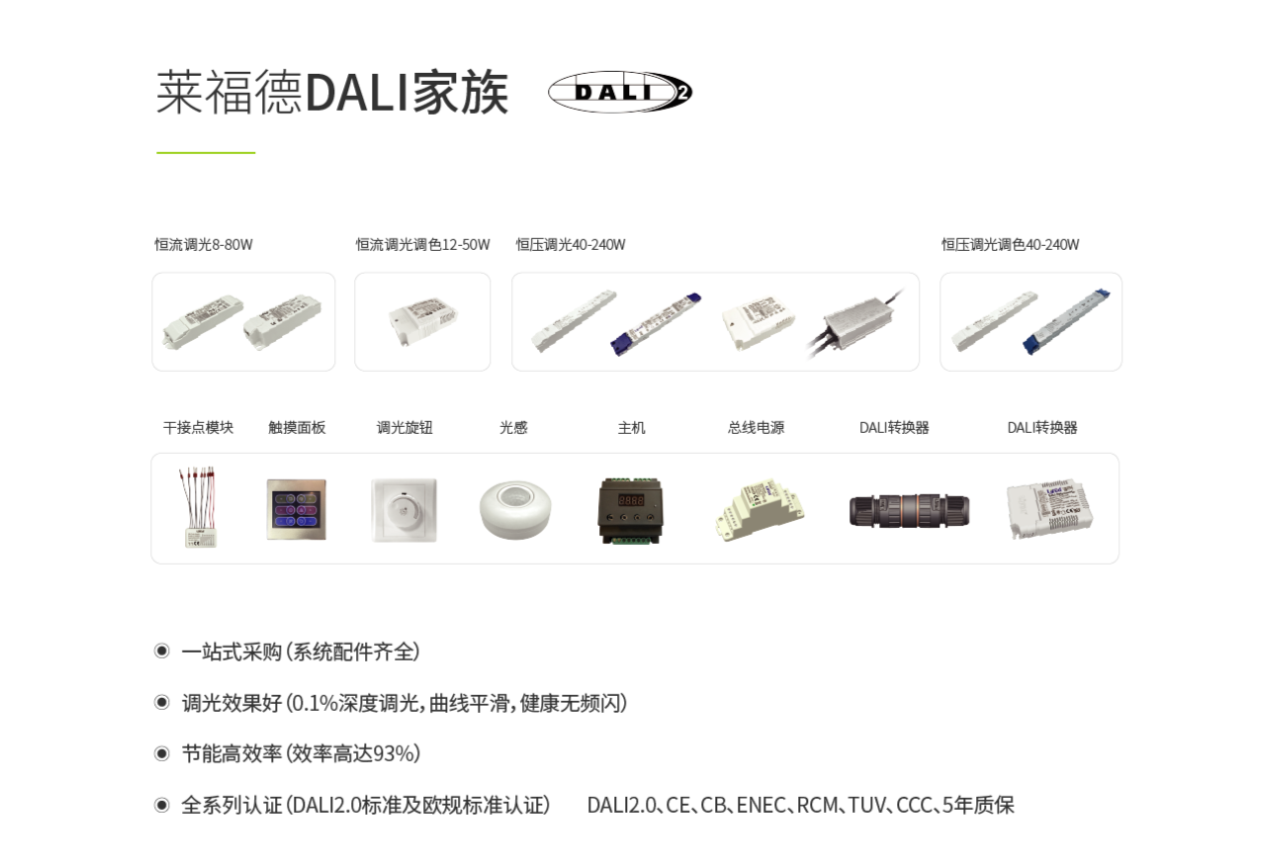 在DALI技術(shù)研究上,自2014年萊福德首款DALI產(chǎn)品上市,成為國內(nèi)最早一批DALI會員開始,萊福德在DALI控制驅(qū)動上不斷布局,至今已有近百款各功率型號的DALI產(chǎn)品。
