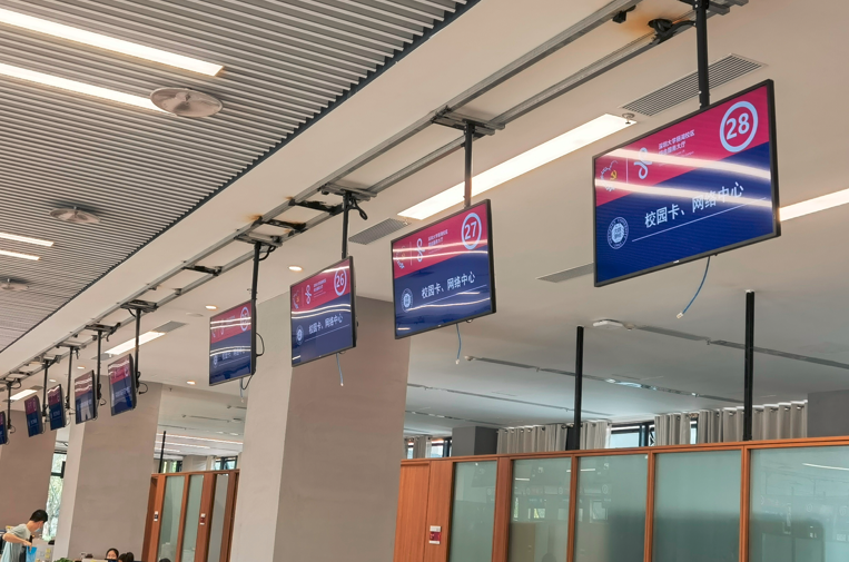 作為面向全校師生的綜合性服務平臺,麗湖校區綜合服務大廳秉承“便捷、規范、高效、精進”的服務理念,以提高管理水平和效率為目的,在服務大廳窗口吊裝式安裝了多臺飛利浦數字標牌3451D。在飛利浦商顯先進的軟硬件技術支持下,學校工作人員可以通過后臺統一管理,將日常校務信息以視頻、音頻、圖片和滾動字幕的形式,傳遞到服務大廳的數字顯示終端,為廣大師生筑造起一座數字化“溝通橋梁”,全面提升麗湖校區形象面貌,切實提高綜合服務大廳的管理服務水平。