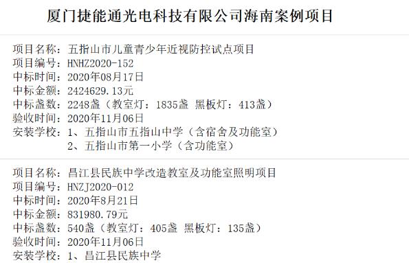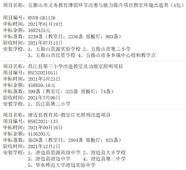 包括入選 2021 年7 月5 日海南省教育廳公布的 20 所海南省兒童青少年近視防控示范學校之一的五指山中學燈光改造(含教室、宿舍及功能室)。