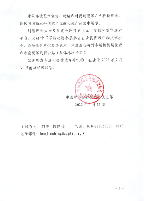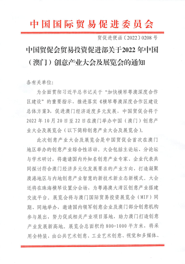 中國貿(mào)促會貿(mào)易投資促進部關(guān)于2022年中國(澳門)創(chuàng)意產(chǎn)業(yè)大會及展覽會的通知