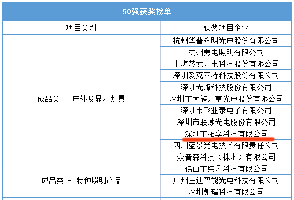 作為北美地區LED照明產品優質供應商,拓享科技憑借其產業化的生產規模、突出的產品研發能力及精細化的管理水平,歷經自主申報、初步審核、復審投票、專家連線、終審會議等環節,從223家申報企業中脫穎而出,成功入圍成品類獲獎企業。