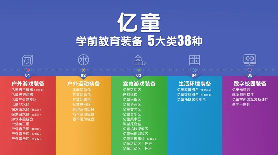 扎根學前教育領域20余年,億童將先進教育理念融入裝備研發設計,將課程與裝備進行有機結合,推出戶外游戲裝備、戶外運動裝備、室內游戲裝備、生活環境裝備、數字校園裝備5大類38種產品,為建設高品質的科學保教幼兒園,提供全方位、個性化、一站式的整體解決方案。