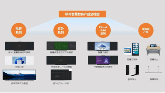 從2015年至今,歐帝智慧黑板的產(chǎn)品線也日益豐富,形成了歐帝智慧教育產(chǎn)品全棧圖,我們現(xiàn)在有了電容系列黑板、紅外系列黑板、云黑板和AI黑板系列,我們還有了家族化的配套產(chǎn)品,比如智慧講臺(tái)、智慧班牌、視頻展臺(tái)、智慧照明等。