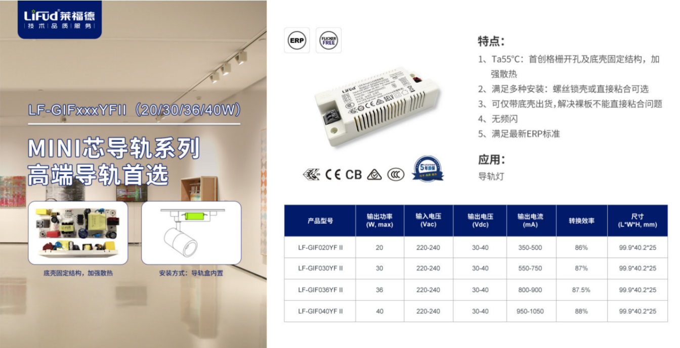 LF-GICxxxYS II(8-40W)為灌膠設計,可應用在Ta70℃,Tc90℃的環境下(常用于燈腔內置),輸入電壓范圍220-240Vac,輸出功率8-40W,滿足市面大多數導軌筒射燈應用需求。