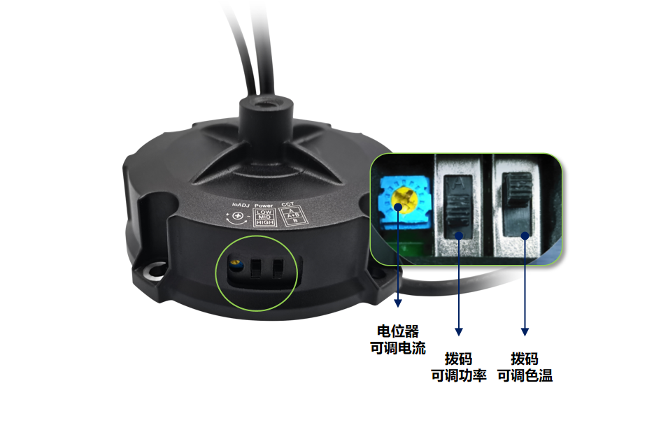 首創(chuàng)三調(diào),三檔功率&色溫?fù)艽a可調(diào),并可通過電位器對三檔功率進(jìn)一步精確微調(diào)實現(xiàn)一款型號多種應(yīng)用,降低庫存?zhèn)湄泬毫Α?