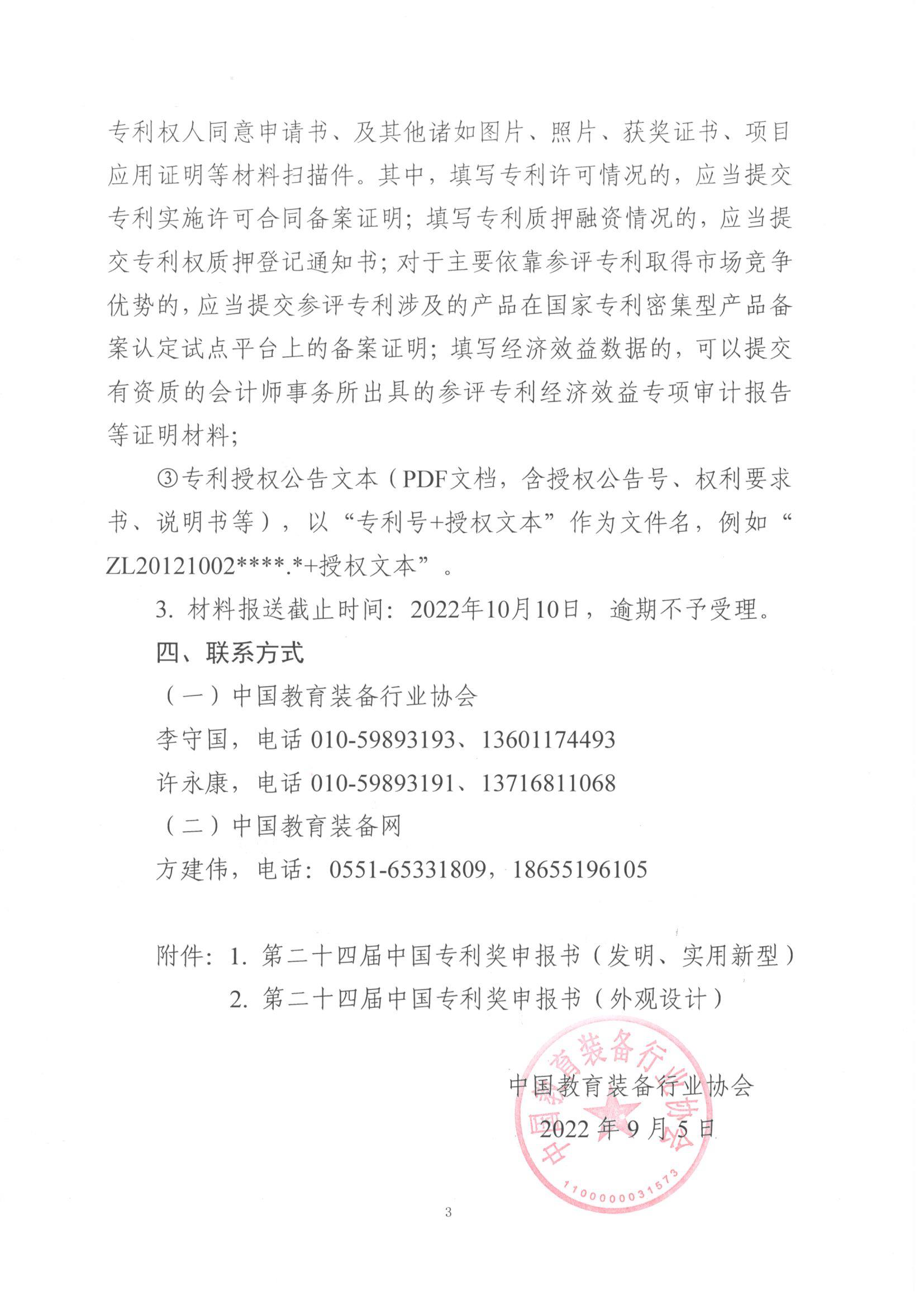 近日,國(guó)家知識(shí)產(chǎn)權(quán)局發(fā)布《關(guān)于評(píng)選第二十四屆中國(guó)專利獎(jiǎng)的通知》(國(guó)知發(fā)運(yùn)函字〔2022〕134號(hào)),國(guó)家知識(shí)產(chǎn)權(quán)局和世界知識(shí)產(chǎn)權(quán)組織共同開展第二十四屆中國(guó)專利獎(jiǎng)評(píng)選工作。為鼓勵(lì)和表彰為教育裝備技術(shù)(設(shè)計(jì))創(chuàng)新及教育裝備行業(yè)發(fā)展做出突出貢獻(xiàn)的會(huì)員單位,中國(guó)教育裝備行業(yè)協(xié)會(huì)(以下簡(jiǎn)稱“中教協(xié)”)作為中國(guó)專利獎(jiǎng)推薦單位,擬組織“第二十四屆中國(guó)專利獎(jiǎng)”申報(bào)工作,并擇優(yōu)推薦。現(xiàn)將有關(guān)事項(xiàng)通知如下: