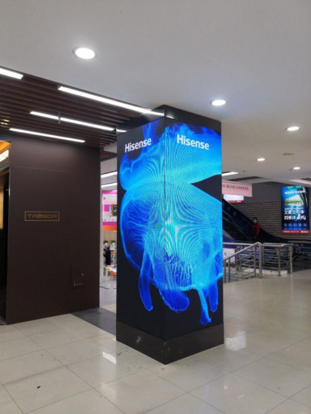 在長沙海信廣場,海信商用顯示則為其打造了一個充滿科技感的“立柱型”LED顯示屏,其中畫面可以通過LED立柱的四側進行展示,兼具畫面立體感和科技感。