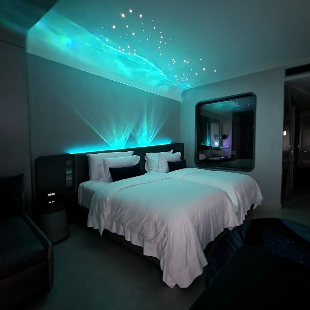 一天的游玩后,回到房間,床榻邊也伴隨著銀河流轉(zhuǎn),點(diǎn)點(diǎn)繁星,讓旅客如置身太空之中,伴隨星空移動(dòng)緩緩入睡。