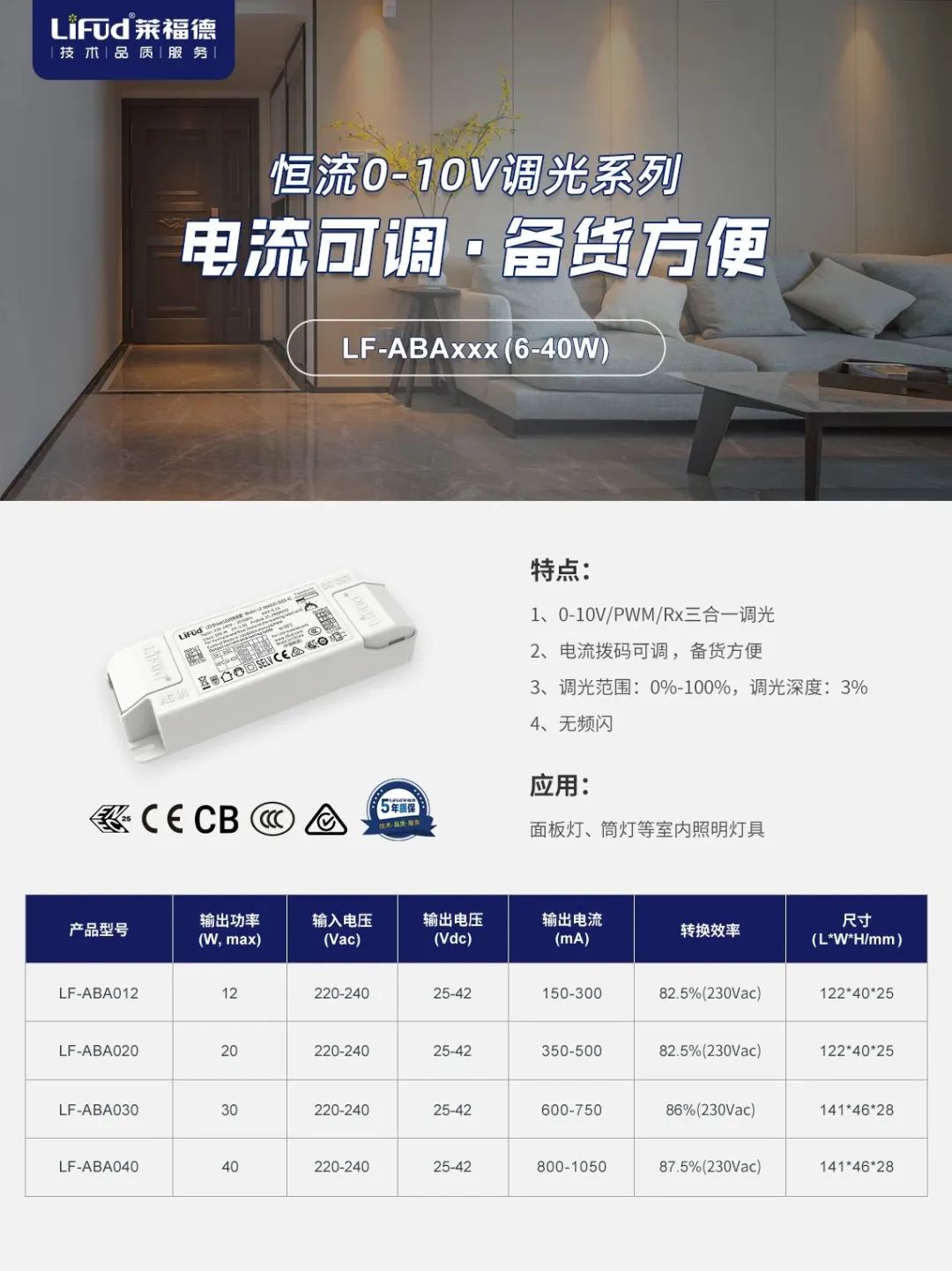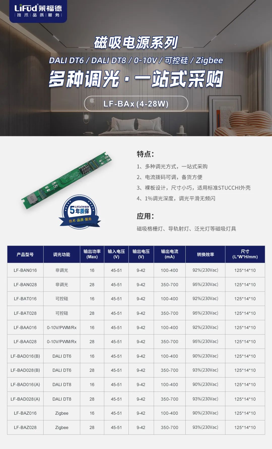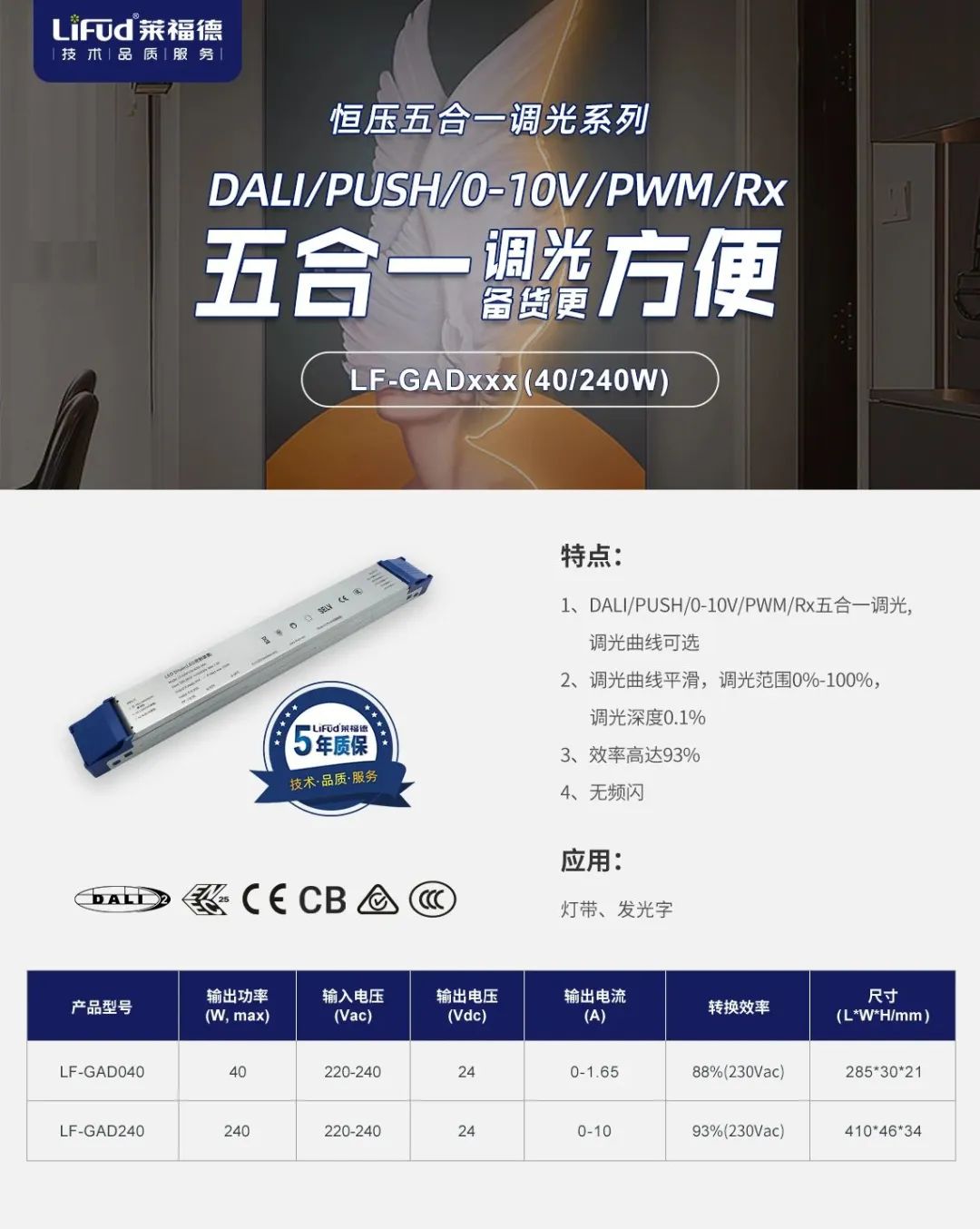 DALI/Push/0-10V/PWM/Rx五合一調光,一款產品多種應用,減少燈具Sku,備貨更方便;轉換效率高達93%,節能高效;調光平滑無頻閃,項目應用燈光效果更優異。