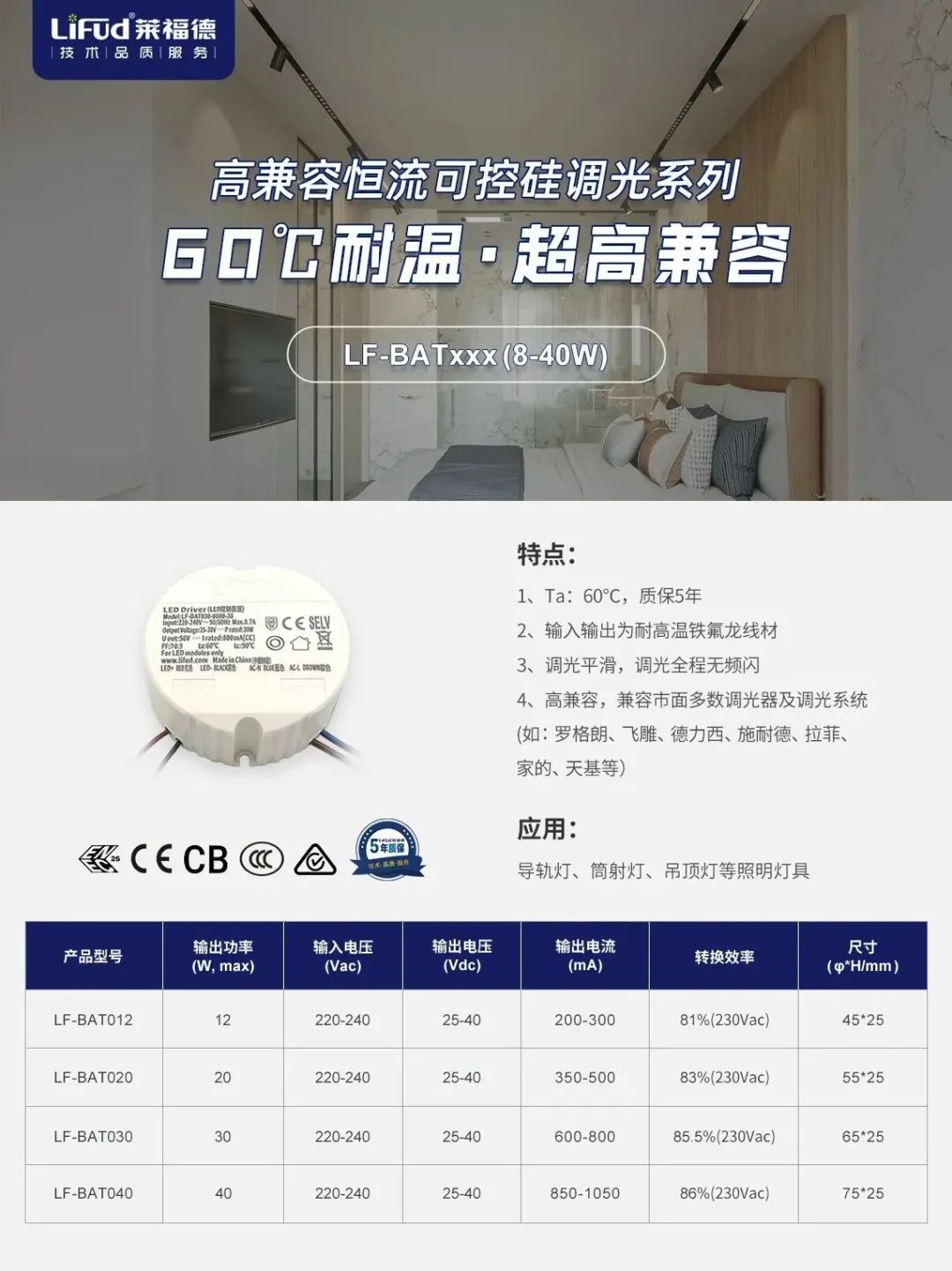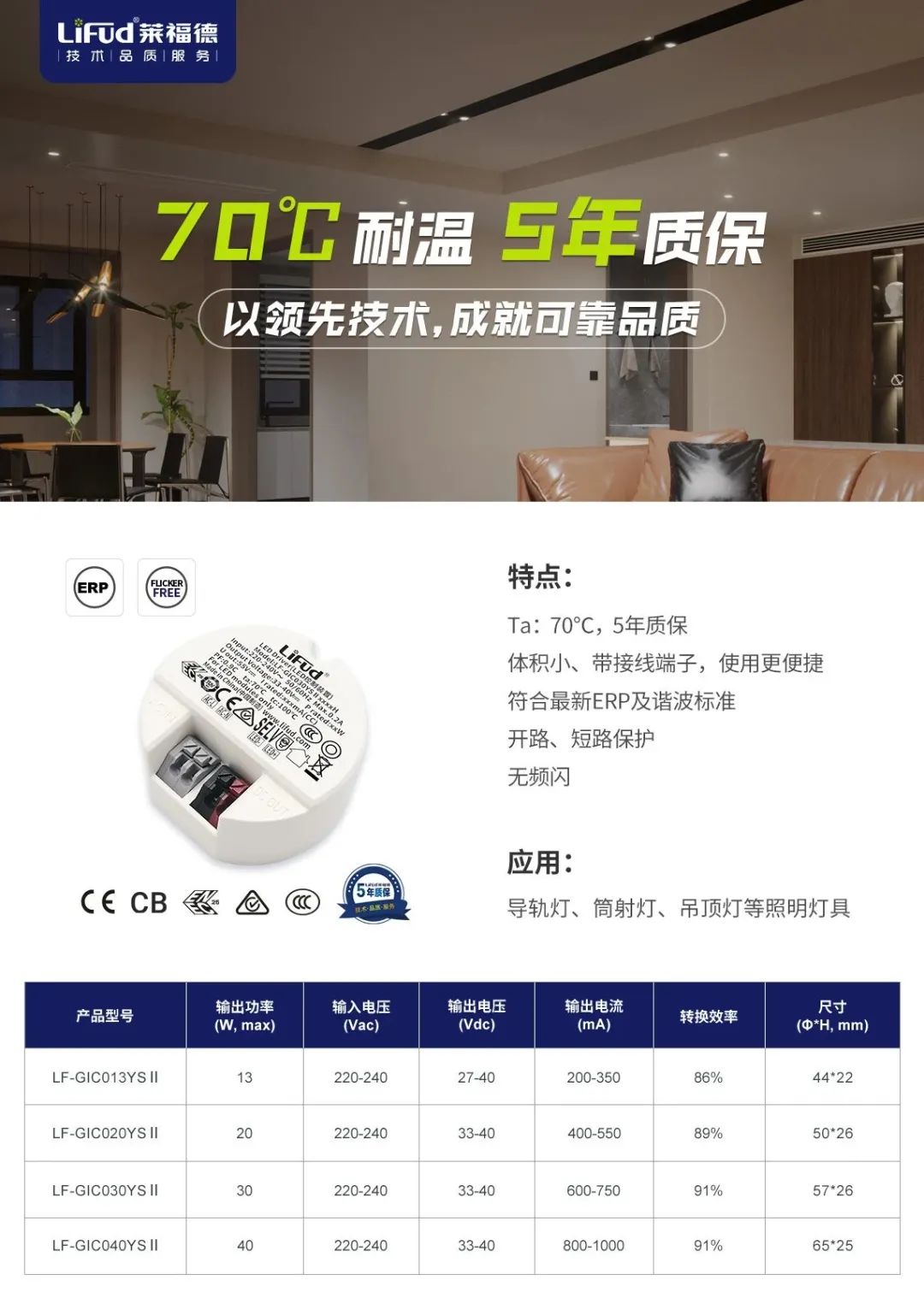 該系列為萊福德經典歐規面板燈電源,此次升級不僅優化性能使產品滿足最新ERP及諧波標準,更應市場需求,擴充了60W功率段,為更多應用場景需求提供選擇。