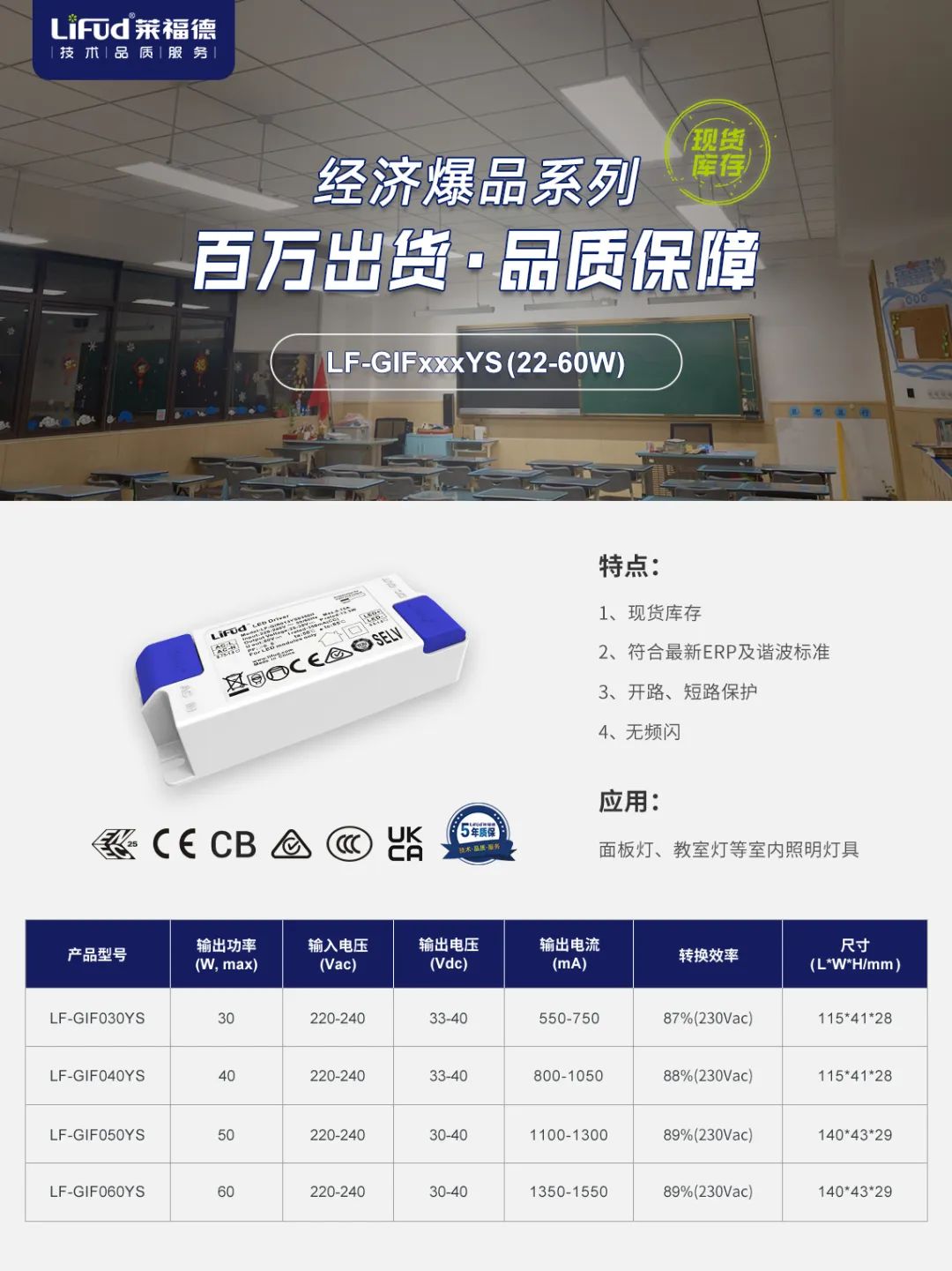 萊福德教室照明專用電源之一,作為常規高效的代表系列,本次升級優化設計方案,進一步提高產品效率,助力教室照明健康節能!