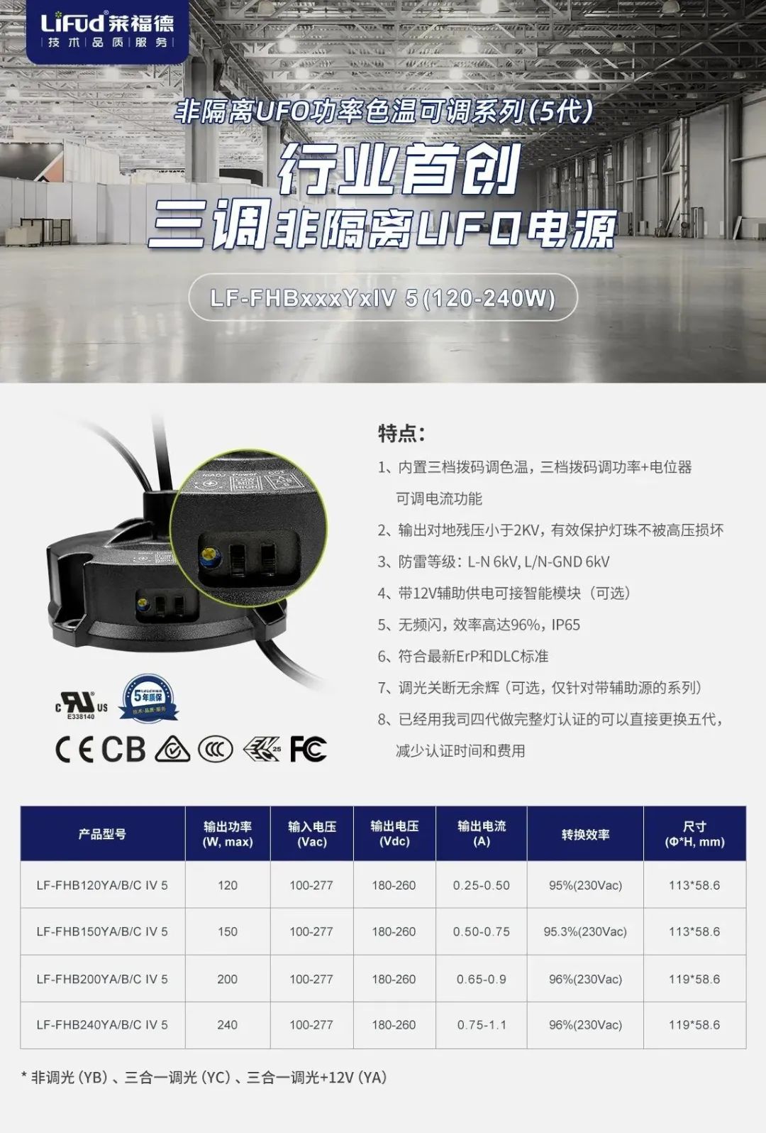 從一代到五代,五年執著一路進化。2022年萊福德UFO五代正式面世,不僅優化參數性能,在外觀功能設計上也突破常規,首創集成調色溫、調功率、調電流三調撥碼,引領行業發展。