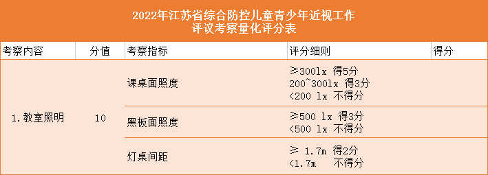 健康的光環境作為兒童青少年近視防控中關鍵的一環,越來越得到社會各界的重視。在江蘇省教育廳印發的《2022年江蘇省綜合防控兒童青少年近視工作評議考察和視力監測方案》中,對課桌面照度、黑板面照度、燈桌間距等做了明確規定和要求,更是將教室照明考核分數量化為整體的10%。