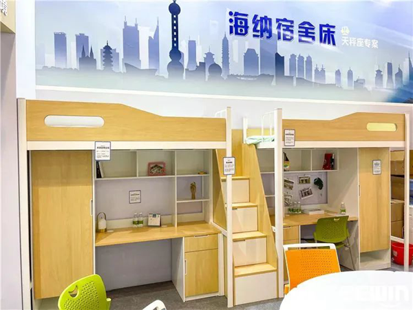 此次展會詩敏帶來了自主研發的新品,格瑞課桌椅、海納宿舍床及范雅課椅等產品。