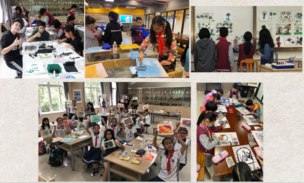 另一邊,小學三年級的學生在印制區域,用專業制作裝備,將實物肌理與印痕建立聯系,設計制作版畫作品;