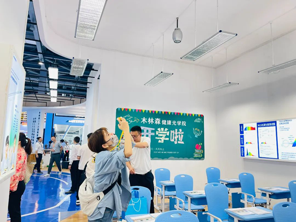 現(xiàn)場采用“木林森健康光學(xué)院大講堂”的形式呈現(xiàn)了豐富的健康光知識,包括普及健康光、智慧校園解決方案、近視防控平臺、教室照明改造方案等。