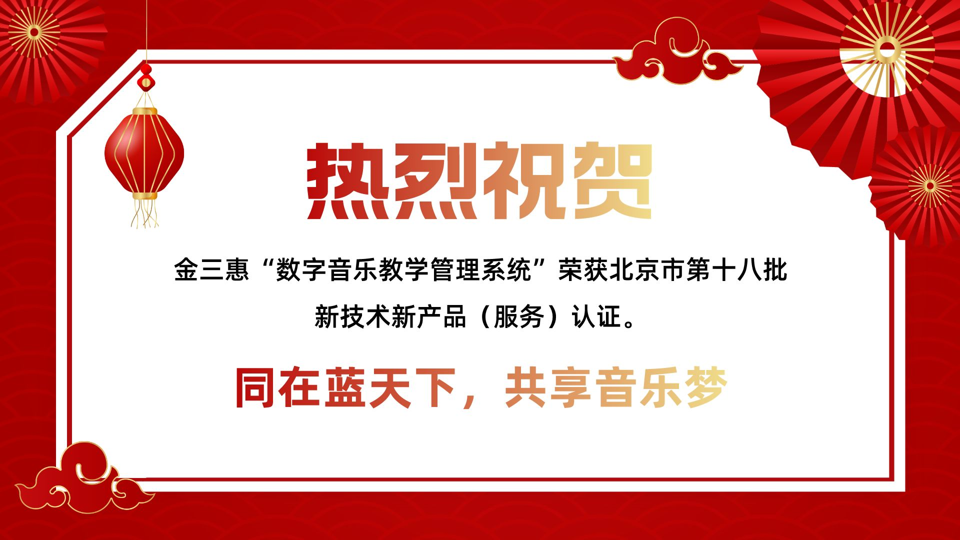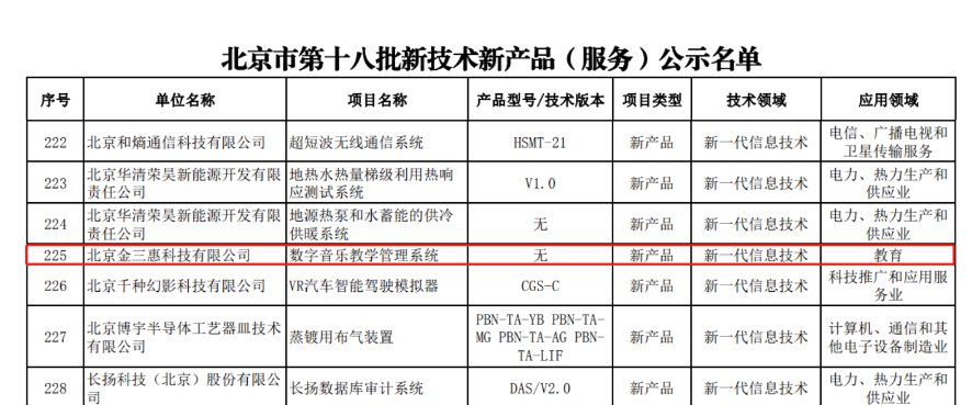 【企業捷報】金三惠“數字音樂教學管理系統”榮獲北京市第十八批新技術新產品(服務)認證。