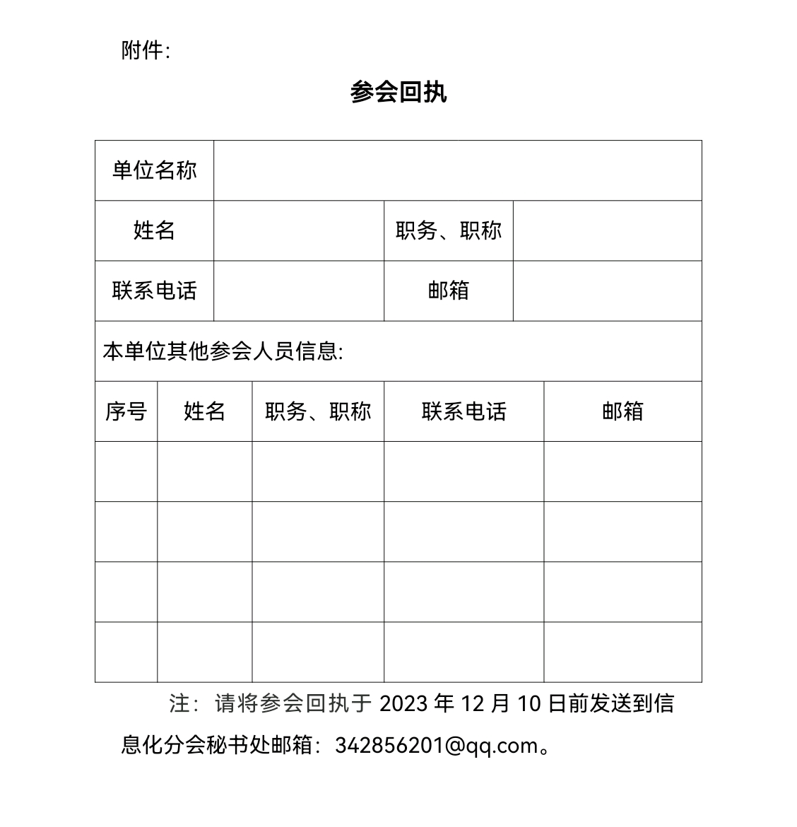 填寫參會(huì)回執(zhí)(附件),于2023年12月10日前發(fā)送到信息化分會(huì)秘書處(郵箱:[email protected])報(bào)名參會(huì)。