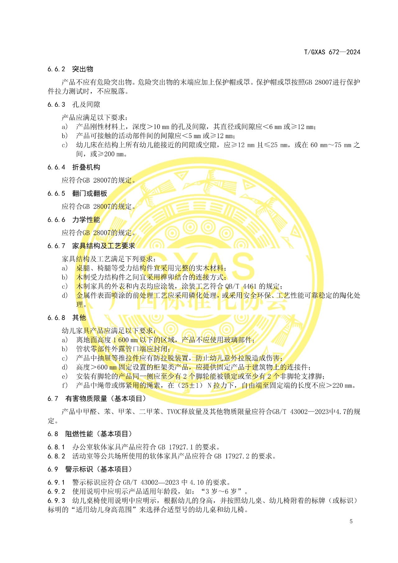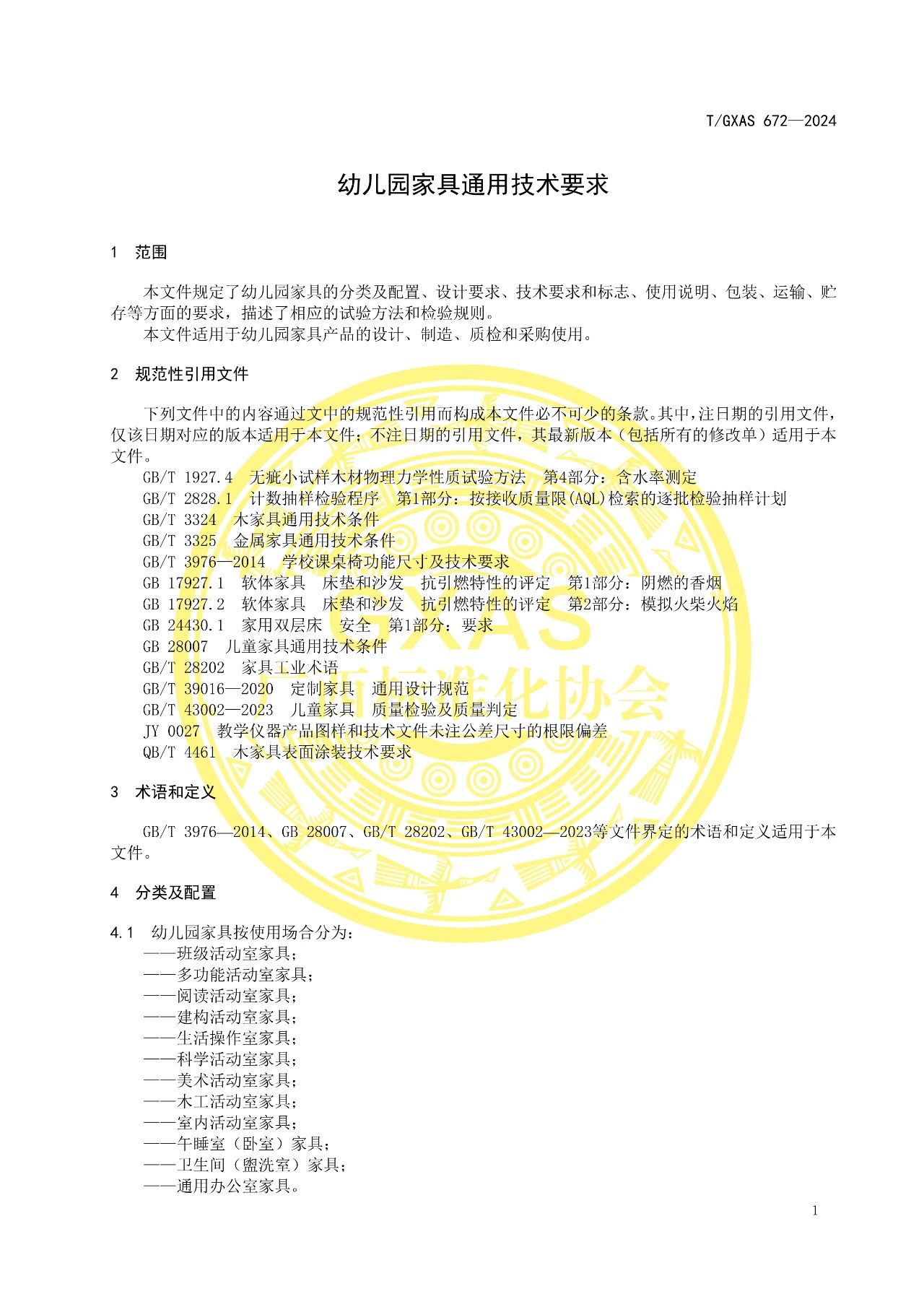 《幼兒園家具通用技術要求》團體標準規定了幼兒園家具的術語和定義,涵蓋了幼兒園家具的產品分類及配置、設計要求、技術要求、試驗方法、檢驗規則、標志、使用說明、包裝、運輸和貯存。其主要技術內容包括外觀、材料理化性能、有害物質限量、阻燃性能、警示標識、家具安裝等。