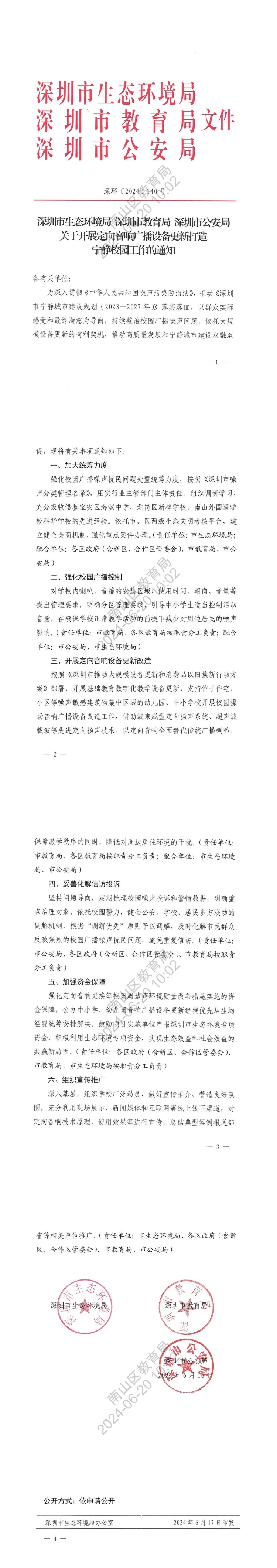 近日,深圳市生態環境局等三部門聯合印發《關于開展定向音響廣播設備更新打造寧靜校園工作的通知》,通知表示,為深入貫徹《中華人民共和國噪聲污染防治法》,推動《深圳市寧靜城市建設規劃(2023-2027年)》落實落細,持續整治校園廣播噪聲問題,依托大規模設備更新的有利契機,推動高質量發展和寧靜城市建設雙融雙促。
