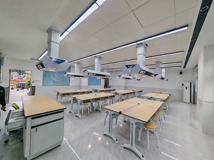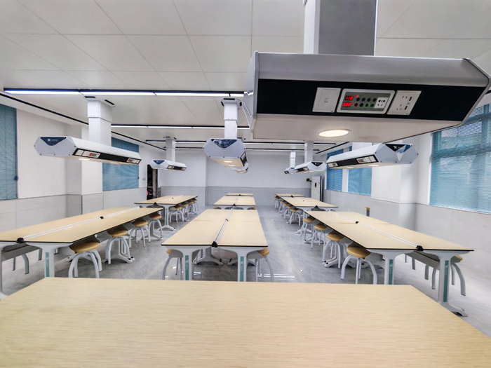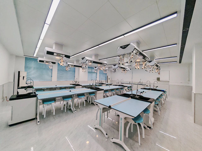 童園科技為深圳市龍華區新華中學建設完成實驗室2間,分別為化學智能實驗室、物理智能實驗室。其中化學智能實驗室建設采用童園T系列化學實驗桌,搭配童園智能+頂裝系統、水柜等產品。其中智能+頂裝系統模塊化頂裝系統針對傳統實驗室對樓層要求、空間固化、施工難度大等痛點,采用頂裝模塊化設計,施工方式從地面轉換到頂部,簡化教室內部設計,充分解放地面,極大地提高教室空間利用率,便于空間再組合。此次童園智能+頂裝系統不僅實現了電、風集成供給,還可根據實際需求加減或更換功能模塊,滿足個性化需求,以適應多種教學模式。