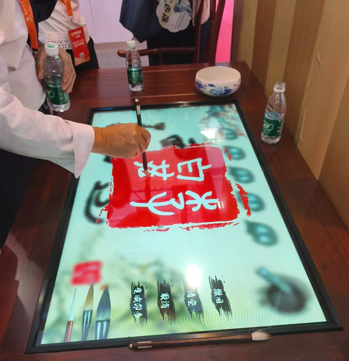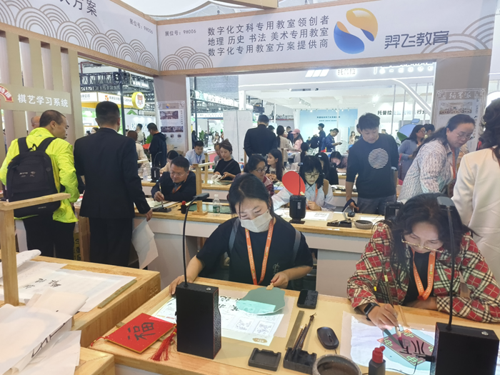 羿飛教育此次展示的亮點之一是其數字化書法教室。該教室采用了微投臨摹和臨摹屏兩種方式,讓學生能夠更直觀、更精確地學習書法藝術。微投臨摹技術通過微型投影儀將字帖內容投射到臨摹紙上,學生可以直接在投影的字帖上進行練習,而臨摹屏則提供了一種更為現代化的互動體驗,學生通過觸摸屏進行書寫練習,系統即時反饋書寫效果。除此之外,羿飛教育還創新性地引入了筆尖跟蹤技術,通過高精度的筆尖追蹤,為學生提供更為細致的書寫指導和反饋,極大地提升了書法教學的互動性和趣味性。
