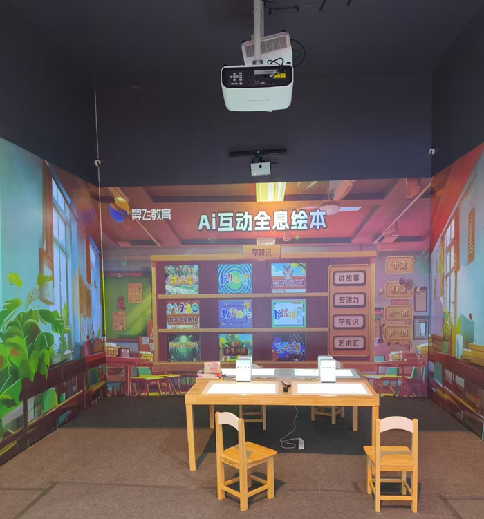 在閱讀空間的創新上,羿飛同樣不甘落后。這次帶來了AI互動全息閱讀空間,通過三面墻的投影互動方式,為學生創造了一個沉浸式的互動閱讀娛樂環境。在這個空間中,學生可以與全息影像中的內容進行互動,體驗到前所未有的閱讀娛樂樂趣。