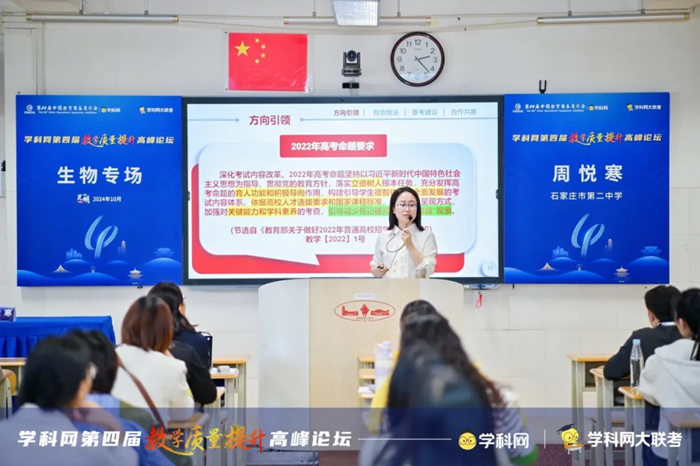 石家莊市第二中學生物教研室主任周悅寒的講座主要有以下三個方面:一是以河北卷為主,詳細分析近幾年新高考試題的命題特點、考查方向、學科素養等,對于學生的實驗探究能力和創新能力培養提出相應的解決策略。二是介紹石家莊二中生物學科一二三輪復習的整體規劃,尤其對于一輪復習提出精準備考的詳細做法。三是石家莊二中雙自主四環節課堂簡介及課例分析,幫助老師們盡快實現課堂改革,實現由教到學的改變。