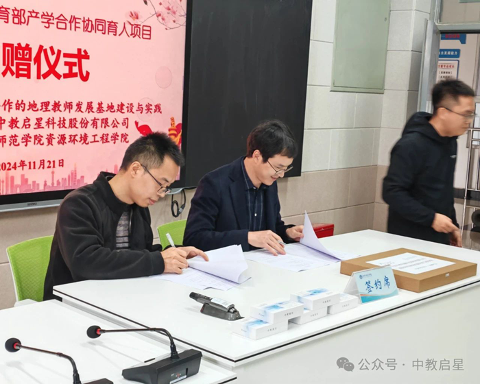 2024年11月21日下午,綿陽師范學院與北京中教啟星科技股份有限公司聯合舉辦教育部產學合作協同育人項目捐贈培訓活動。北京中教啟星科技股份有限公司的川渝負責人黎江川和技術負責人羅振天代表公司參與本次活動,資源環境工程學院的黨委書記聶東、院長陳浩、副院長林孝先、副院長黃天志以及多位教師代表出席捐贈儀式。