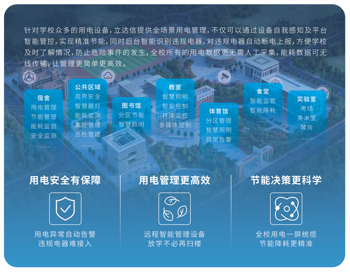立達信面向全校提供全校物聯智控光環境,針對眾多的用電設備,提供全場景用電管理,不僅可以通過設備自我感知及平臺智能管控,實現精準節能,同時通過AI電流指紋算法技術,智能識別違規電器,對違規電器自動斷電上報,方便學校及時了解情況,防止危險事件的發生,全校所有的用電數據更無需人工采集,能耗數據可無線傳輸,讓管理更簡單更高效。
