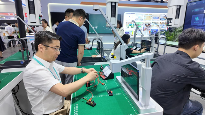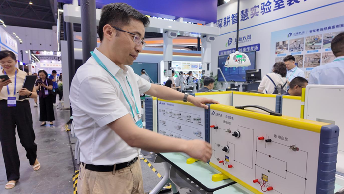 6月20日,在智能實驗教學設備展示區,上海大風集團董事長劉建華向參觀觀眾演示了AI智能教考練一體機,該設備搭載 AI 智能識別系統,能夠實時監測實驗過程中的操作步驟,極大提升實驗教學的安全性與效率。劉建華介紹道:“我們希望通過這樣的創新設備,打破傳統實驗教學的局限,讓學生在更科學、安全的環境中掌握實驗技能”。