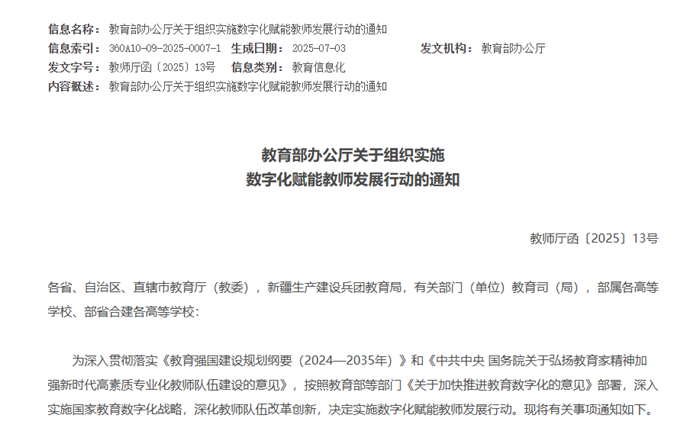 7月3日,教育部辦公廳發(fā)布關(guān)于組織實(shí)施數(shù)字化賦能教師發(fā)展行動(dòng)的通知:按照教育部等部門《關(guān)于加快推進(jìn)教育數(shù)字化的意見》部署,深入實(shí)施國(guó)家教育數(shù)字化戰(zhàn)略,深化教師隊(duì)伍改革創(chuàng)新,決定實(shí)施數(shù)字化賦能教師發(fā)展行動(dòng)。