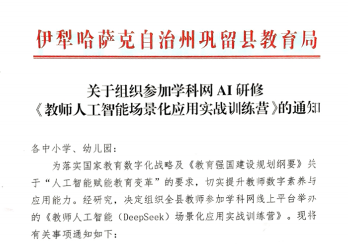 加強(qiáng)數(shù)字化教師隊(duì)伍建設(shè),是未來教育數(shù)字化轉(zhuǎn)型的必經(jīng)之路。『新疆伊犁哈薩克自治州鞏留縣教育局』積極響應(yīng)政策,為落實(shí)國(guó)家教育數(shù)字化戰(zhàn)略及“人工智能賦能教育變革”的要求,決定于暑期在全縣范圍內(nèi)組織教師進(jìn)行線上學(xué)習(xí),加速一線教師掌握人工智能應(yīng)用方法,提升數(shù)字素養(yǎng)。