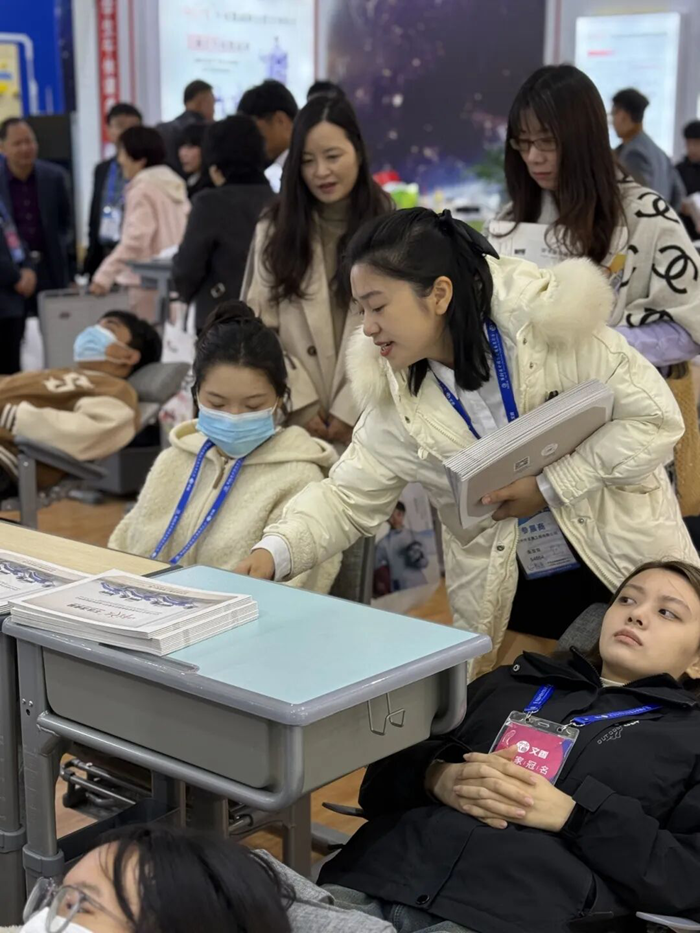 此次展會,師生之友向大家展示了符合國家標準GB/T46016-2025的優質午休課桌椅,尤其是本次展會新品側躺式午休課桌椅受到了眾多師生朋友們的一致好評,小學排距90cm,中學排距100cm就能實現后仰150度午休。課椅座面采用特制的PE藤制材料編織,透氣性好,還具備良好的承托彈性,久坐不易疲勞,提升睡眠質量。工作人員以專業的技術講解以及現場功能展示,向各位參展商展示了產品的亮點。