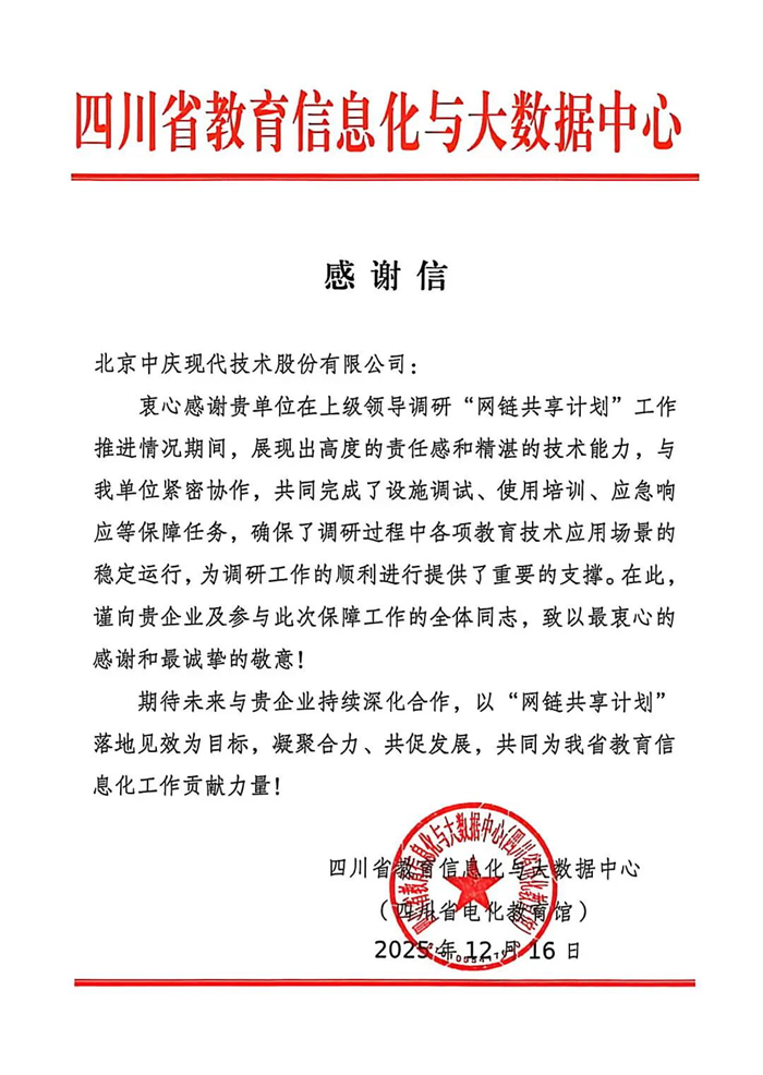 感謝信中指出,現代中慶“展現出高度的責任感和精湛的技術能力,為工作順利進行提供了重要的支撐。”此次四川省教育信息化與大數據中心的致謝,是對現代中慶技術實力與服務品質的高度認可。現代中慶將繼續秉持“技術服務教育”的理念,持續助力四川省教育數字化進程,為促進教育公平、提升教育質量貢獻更多力量。