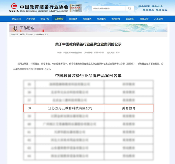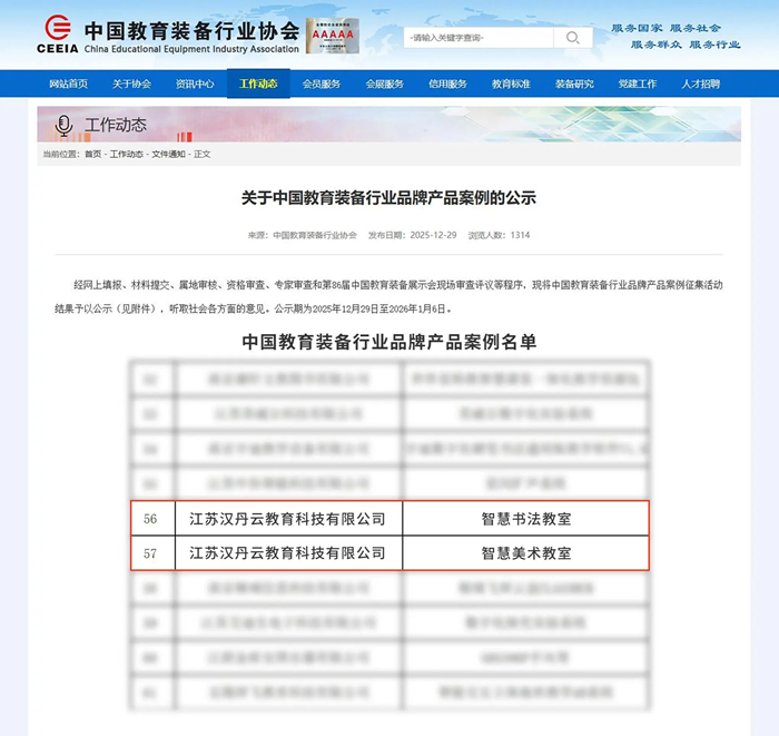 捷音似錦,經線上填報、材料提交、屬地審核、資格審查及專家遴選等多輪嚴格評審,中國教育裝備行業(yè)協(xié)會正式公布了“中國教育裝備行業(yè)品牌企業(yè)案例”及“中國教育裝備行業(yè)品牌產品案例”名單。江蘇漢丹云憑借卓越的綜合實力與創(chuàng)新成果,成功入選“中國教育裝備行業(yè)品牌企業(yè)案例”,旗下智慧書法教室、智慧美術教室雙品齊輝,同步斬獲“中國教育裝備行業(yè)品牌產品案例”權威認證,以藝教匠心賦能教育裝備新征程!